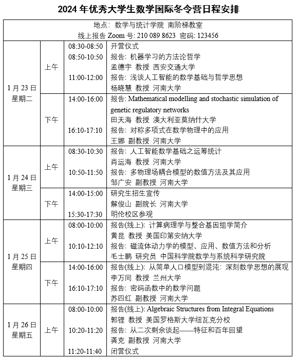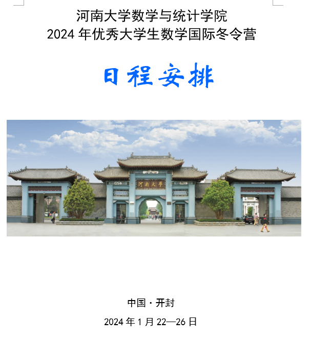 拟定于2024年1月22日—1月26日举办大学生数学冬令营。本次冬令营计划在全国高校范围内招收40名数学、统计学及相关专业的高年级本科生,来我院进行集中交流。