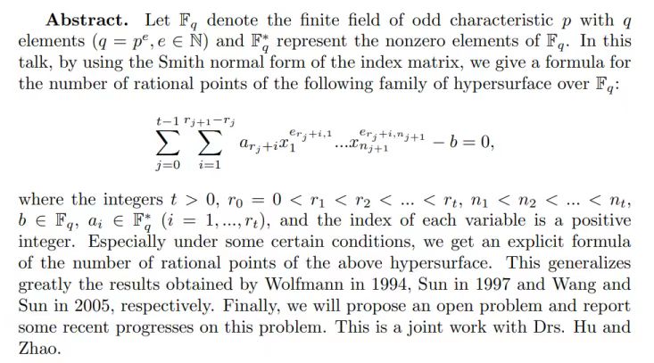 报告题目:The number of rational points of a family of hypersurfaces over finite fields