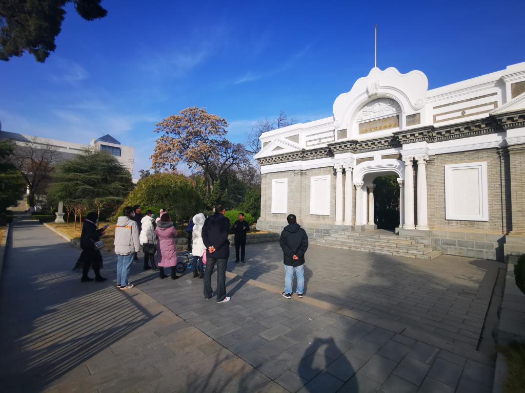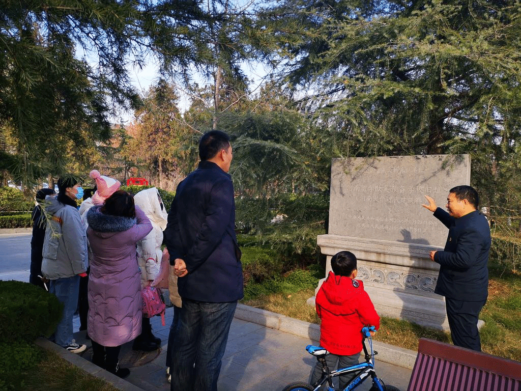 明伦校区南门内。史富强对于我校百年发展历程有着全面的了解、研究和精准把握,大家很荣幸能听到他关于校史校训的专业讲解。他从镌刻于南大门内侧门楣上的“明德、新民、止于至善”的校训讲起,以明伦校区主干道两侧的近代建筑群的历史脉络为中心,讲述了预校大门、六号楼、小礼堂、复校纪念碑、文物馆、七号楼、邓拓碑、“河大红”牡丹园、校歌石、东西斋房和大礼堂等建筑的历史渊源和相关的河大故事。300米的路程,50分钟的讲解,使得看似熟悉的河大风景和故事又栩栩如生地呈现在大家的眼前,深深地印在大家的脑海里,随行的小朋友也听得很入迷。