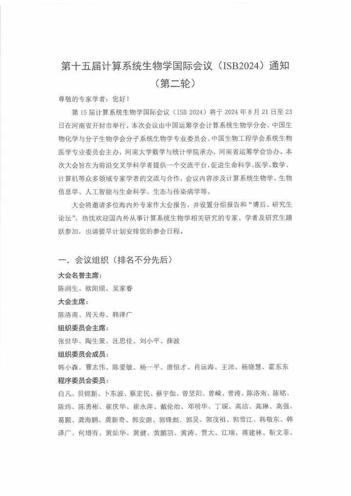 第十五届计算系统生物学国际会议(ISB2024)通知 (第二轮)