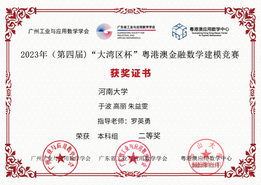 20级金融数学专业于波、高丽以及欧亚学院20级金融数学专业朱益雯三位同学,凭借出色的表现和扎实的金融数学功底,在罗英勇老师的悉心指导下,夺得了本次竞赛的二等奖。他们在激烈的角逐中展现出卓越的团队合作精神和深厚的学术造诣,为学校赢得荣誉。