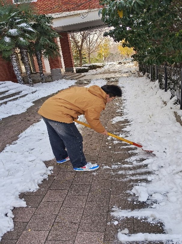在凛冽的寒风中,同学们尽管手脚冰冷,但铲雪的动作丝毫不慢,依旧认真细致,通过不懈的努力,地上的积雪渐渐清理干净,露出整洁的路面。冬天的温度无疑是寒冷的,但是志愿者的内心是火热的,他们用自己的行为给河大学子们带来了温暖,保障了大家的出行安全。