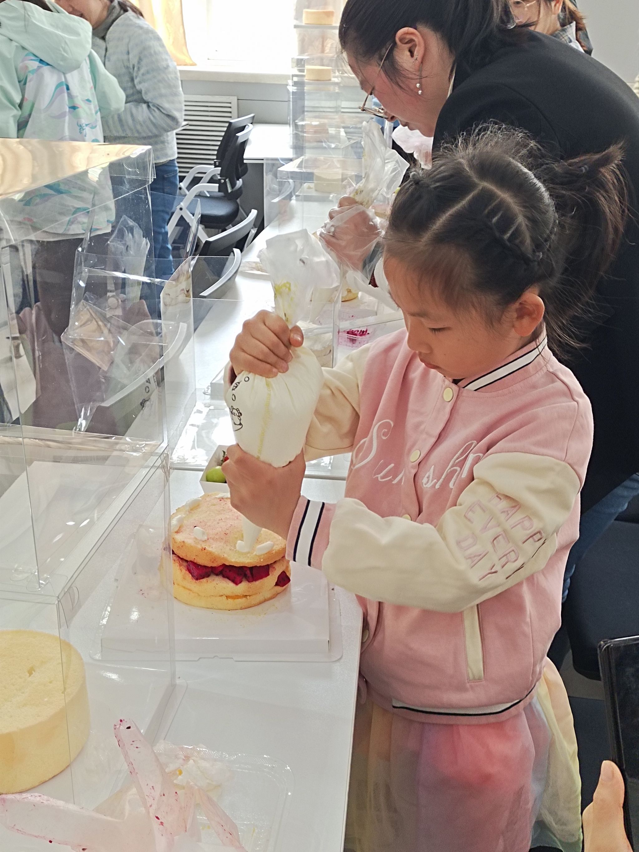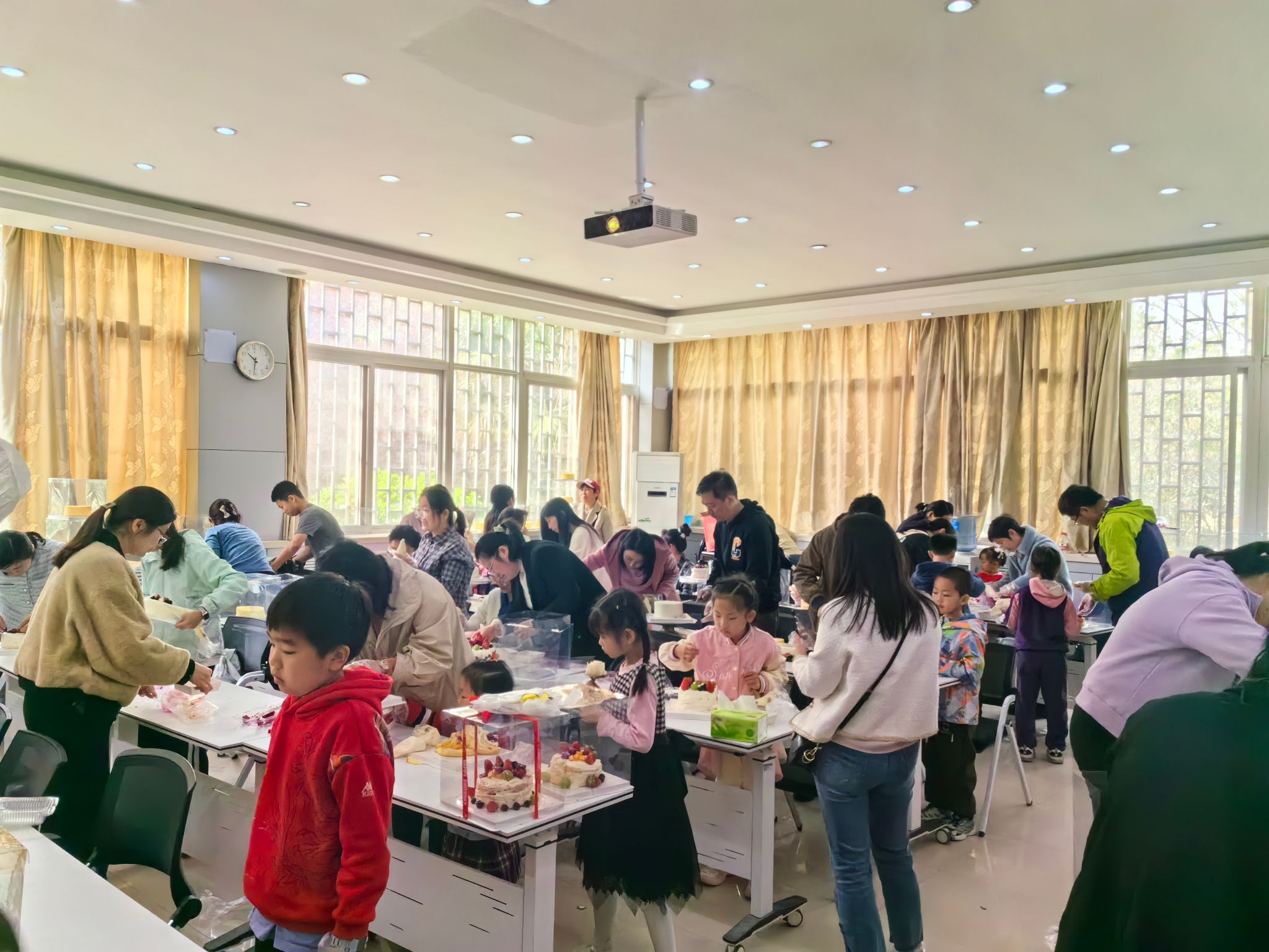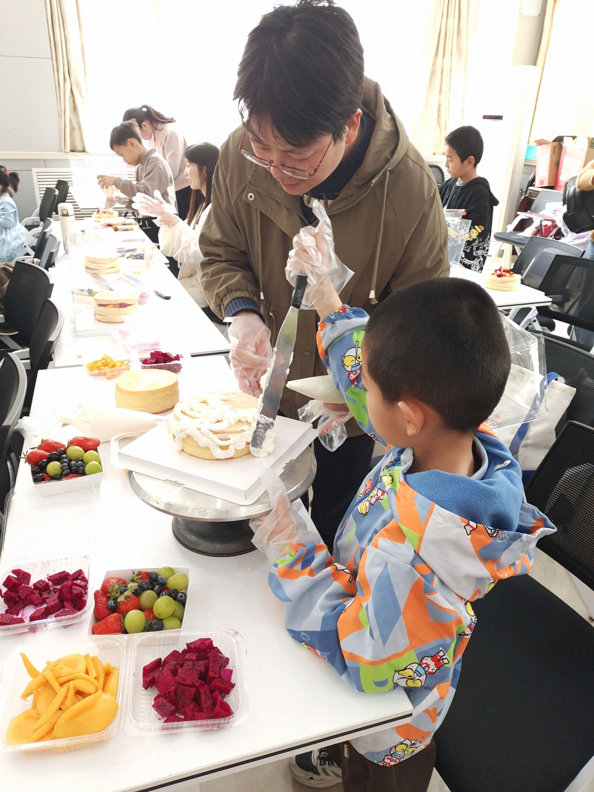 在另一边的蛋糕DIY区域,烘焙师傅耐心指导大家如何制作美味的蛋糕。从蛋糕夹心,抹奶油到表面装饰,每一步都充满了乐趣与挑战。老师们一边交流着心得,一边认真制作着自己的蛋糕,现场气氛温馨而融洽。