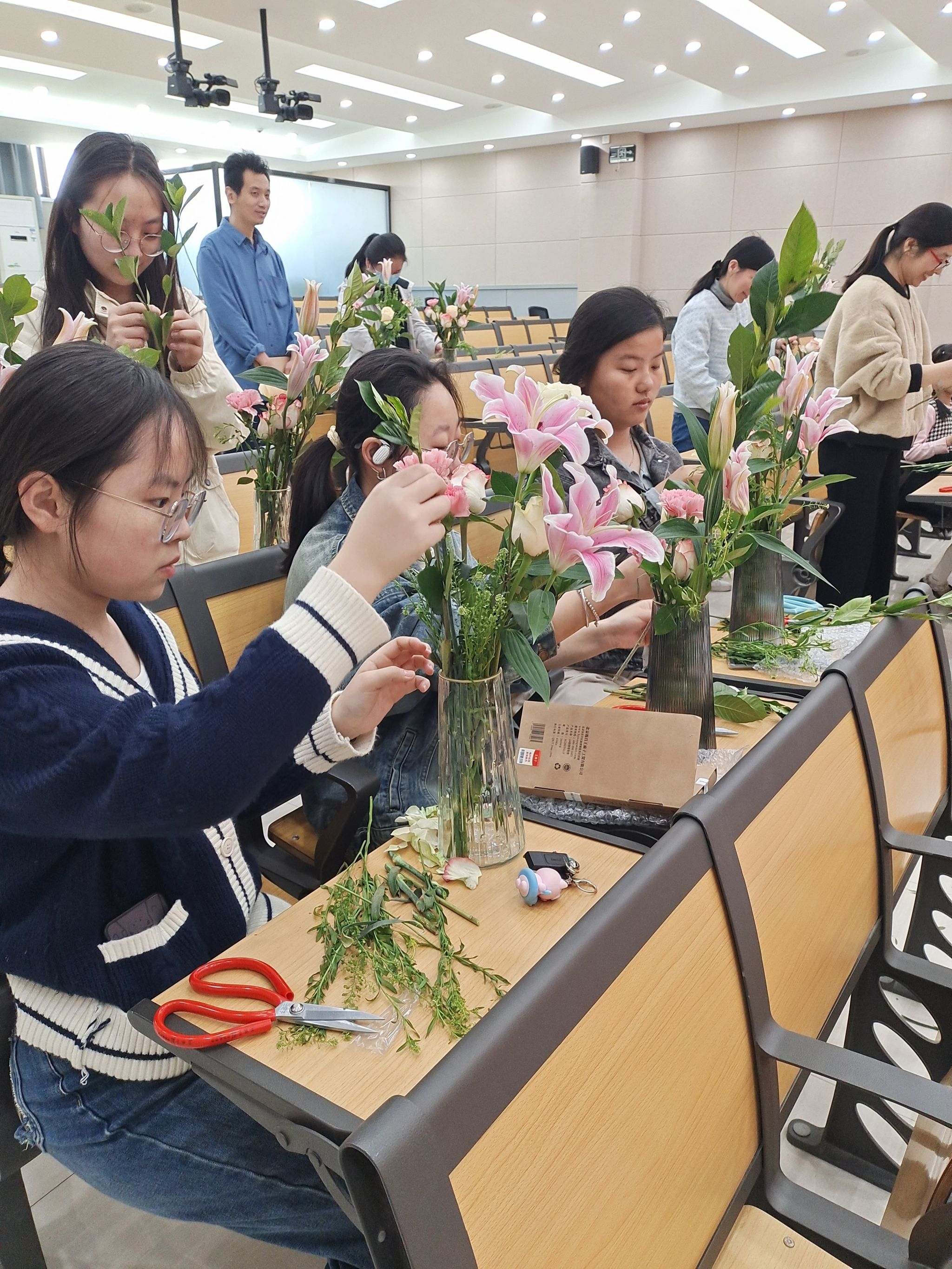 活动场地布置得温馨且浪漫,五颜六色的鲜花和精致的蛋糕材料摆放得整整齐齐,等待着老师们的巧手创作。活动伊始,专业插花师为大家讲解了插花的基本技巧与花卉搭配原则,大家听得津津有味,不时点头称赞。随后,大家纷纷动手,挑选自己喜欢的花卉,开始创作自己的插花作品。