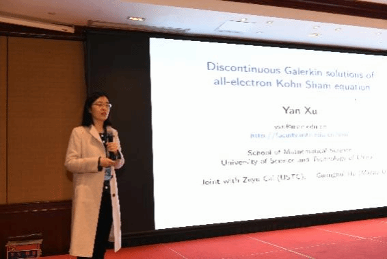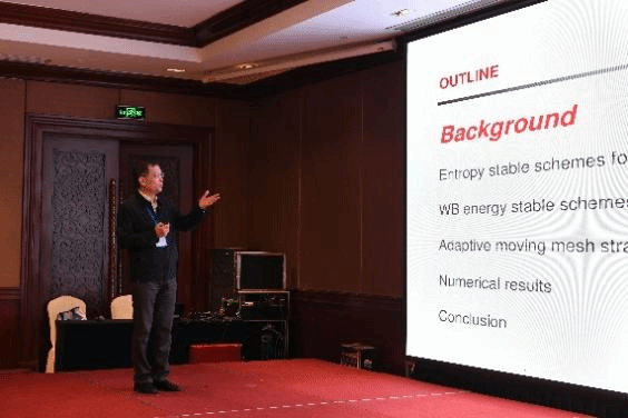 特邀报告环节,北京大学汤华中教授介绍了一种高阶well-balanced并且能量稳定的自适应移动网格有限差分格式,用于非平坦地形下的浅水方程模拟,并通过数值算例验证了格式的精度、稳定性和高效性。厦门大学邱建贤教授提出了基于五阶矩的Hermite加权本质无振荡格式(HWENO-U),显著提升了双曲守恒律问题的计算效率与稳定性。中国科学技术大学徐岩教授展示了DG方法在全电子模拟中的应用,突破了传统LAPW方法的限制,极大地减少了计算自由度并提高了计算效率。