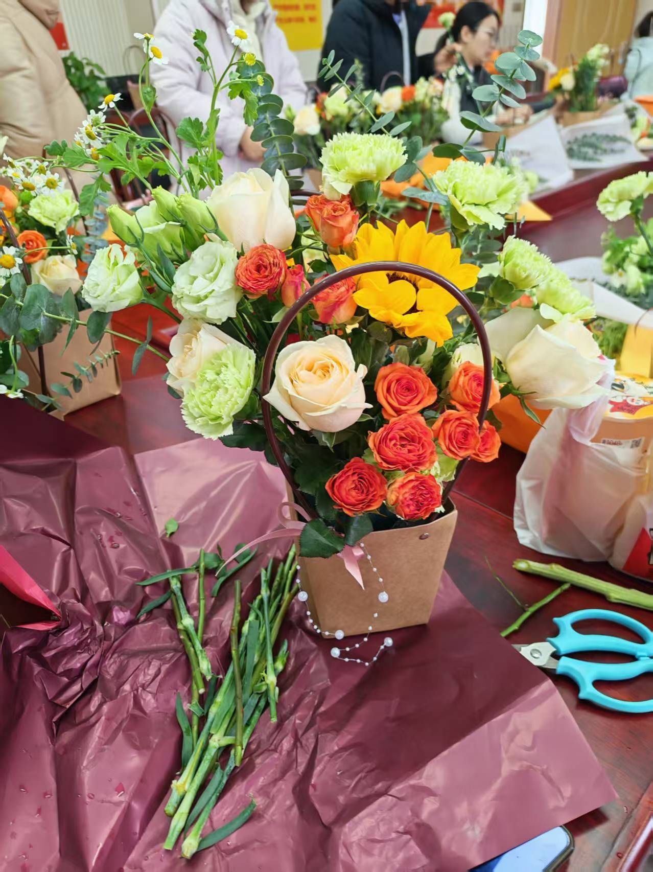 活动现场花香馥郁、氛围温馨。学院工会为大家准备了玫瑰、康乃馨、向日葵、洋桔梗、尤加利叶等丰富花材,并邀请专业花艺师现场指导。花艺师围绕插花的构图技巧、花枝修剪与层次营造等内容进行细致讲解,结合示范演示,手把手传授实操要点,让大家快速掌握插花基础要领。