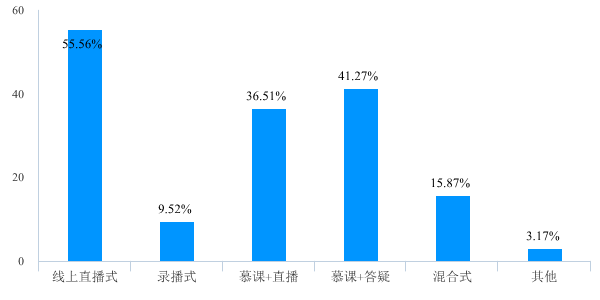 对于教学方式的选择方面(多选题),选择线上直播式的老师占55.56%,选择慕课加直播或者混合式占52.38%,选择慕课答疑的占41.27%,其他方式的占3.17%。说明大多数老师选择的是线上直播,随着学院线上教学工作的进一步推进,相信选择线上直播的老师比例还会进一步扩大。