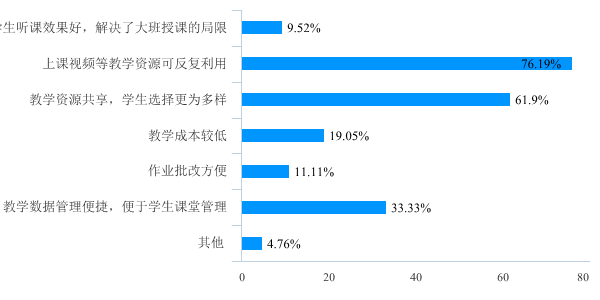由于数学类课程的特点,学院老师平时教学中基本都采用传统的课堂板书教学,普遍对线上教学经验缺乏,通过这一段时间线上教学的开展,广大任课教师体会到线上教学也具有不少的优势,其中优势主要体现以下几个方面:1)上课视频等教学资源可反复利用,便于学生课后自学;2)教学资源可共享,学生选择更为多样;3)教学数据管理便捷,便于课堂管理;4)作业批改方便;5)能解决了大班授课的局限问题等。