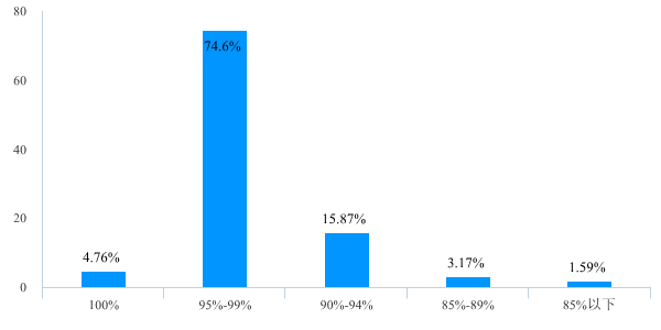 对于学生参与线上学习的积极性方面,79.36%的课程学生出勤率在95%以上,95.23%的课程学生出勤率都在90%以上,对于出勤率低于85%的课程,学院也将继续关注,进一步查找原因,提高学生出勤率。