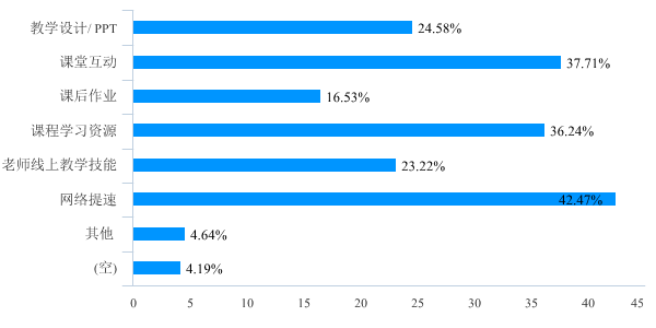 由于数学类课程特点,学院学生平时更多接受的是传统课堂教学,对线上教学接触相对较少。从同学们对于线上教学认可度的调查数据看,对于线上教学特别感兴趣的仅占9.51%,较为感兴趣占34.88%,兴趣一般的占47.68%,说明学生对于线上教学方式的认可和接受还有一个较长的过渡过程。