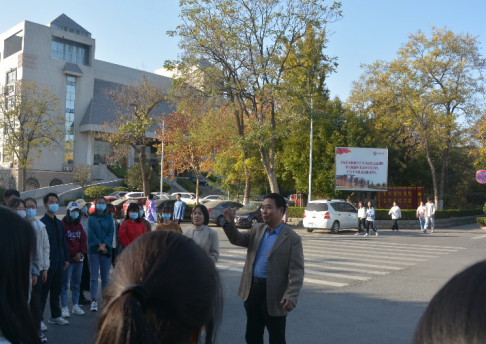 校史校情教育活动是学院新生教育的一项重要内容。新生入校之初,学院便安排相关专家给同学们开展了校史教育讲座。为了充分利用明伦校区近代建筑群和校史馆对同学们进行直观的爱校荣校教育,学院又安排了这次现场教学活动。进入明伦校区南大门,史富强首先为同学们介绍了镌刻在南大门上的八字校训——“明德、新民,止于至善”的典籍出处和丰富内涵,并用通俗易懂的语言让同学们进一步全面理解校训所蕴含的深刻哲理。随后,史富强带领同学们参观了预校大门、六号楼、复校纪念碑、七号楼、牡丹园、校歌石、大礼堂、贡院碑等,并结合当年学校的发展历史,给同学们讲述背后的故事,饱经沧桑的校园建筑和不同景观,见证了学校筚路蓝缕、艰难曲折的百年发展历史。