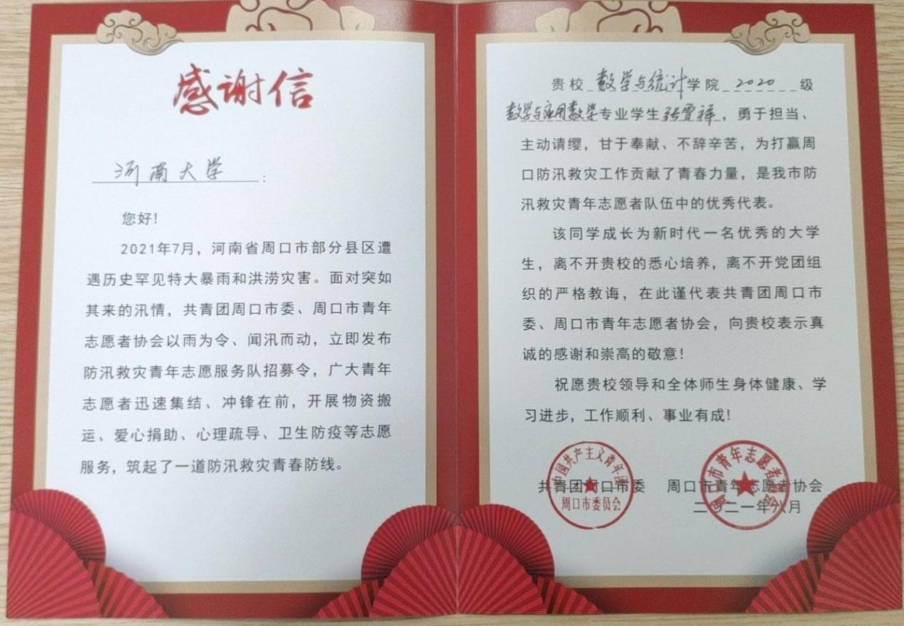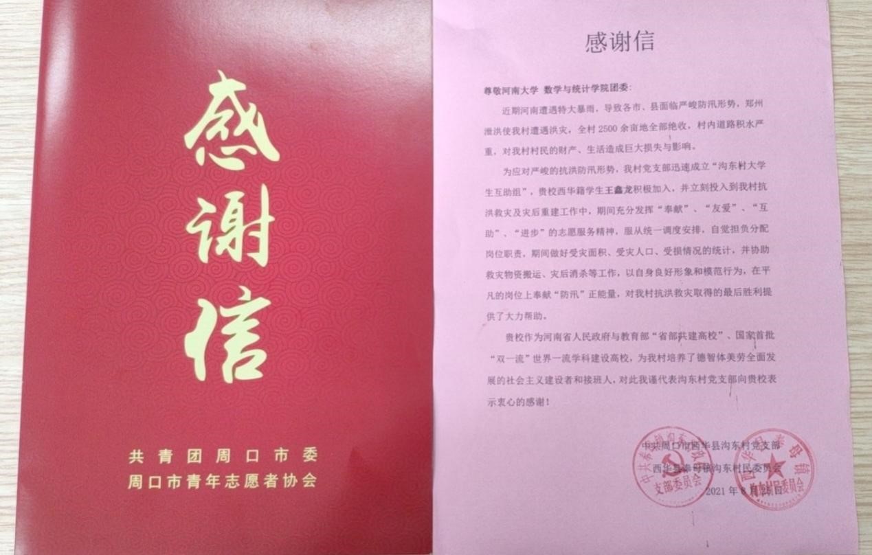 值此“云霄雨霁,彩彻区明”之际,我院收到两封来自周口市青年志愿者协会和周口市西华县沟东村党支部的感谢信。信中对我院王鑫龙和张雪祥两位同学在抗洪救灾及灾后重建工作中体现出的“奉献、友爱、互助、进步”的良好品质予以充分肯定,对他们甘于奉献、不计回报的辛苦付出给予高度赞扬,对学校的精心培养和老师们的悉心教导表示衷心感谢。