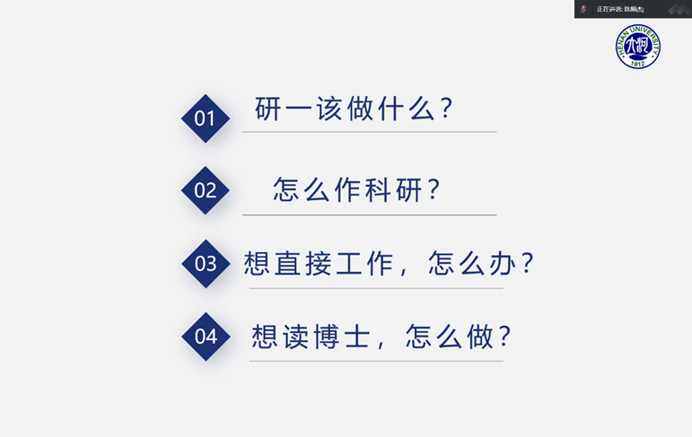 ,强调要多读文章,积极参与到讨论班中锻炼自己,让自己能力变强。对于找工作而言,他结合自己的研究方向告诉大家,研究生期间要提升自身综合素质,为将来就业做准备,做到学有所得,学有所成。对于读博,他认为无论是学硕还是专硕,只要目标坚定,不被外界环境所影响,付出努力,都有可能继续深造。他还告诉大家在研究生期间,可以找一个志同道合的朋友,一起努力,一起进步!