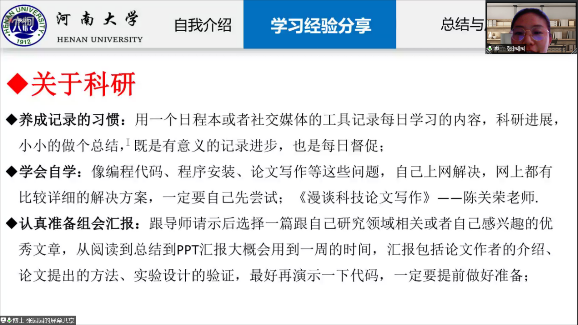 张园园首先进行了自我介绍,接着简要概述了关于硕博连读的报考条件、流程以及优势,然后从课程、尼克成人网