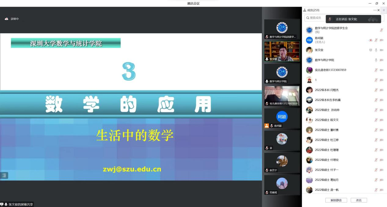 ,深圳大学张文俊教授通过线上的方式给同学们作题目为“例谈数学的智趣用”的趣味科普报告。他通过常见的抽奖问题、约会问题、选举问题、猜心术等9个生活、管理、魔术案例,给同学们讲解了其背后的数学智慧、趣味和应用价值。他的讲座有观点、有案例、有解析,漫谈但不失严谨,通俗却不免深刻,科学又不乏趣味,同学们听得津津有味,兴趣盎然。讲座结束后,线上线下同学们仍意犹未尽,积极参入本次数学文化节的数学互动小游戏中,文化节也同学们的欢声笑语里落下帷幕。