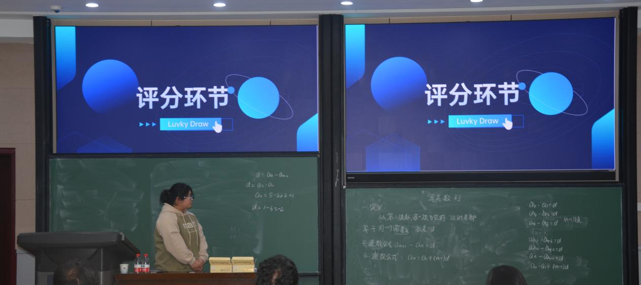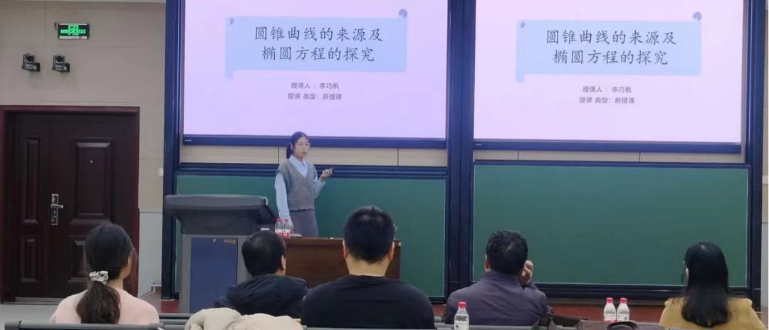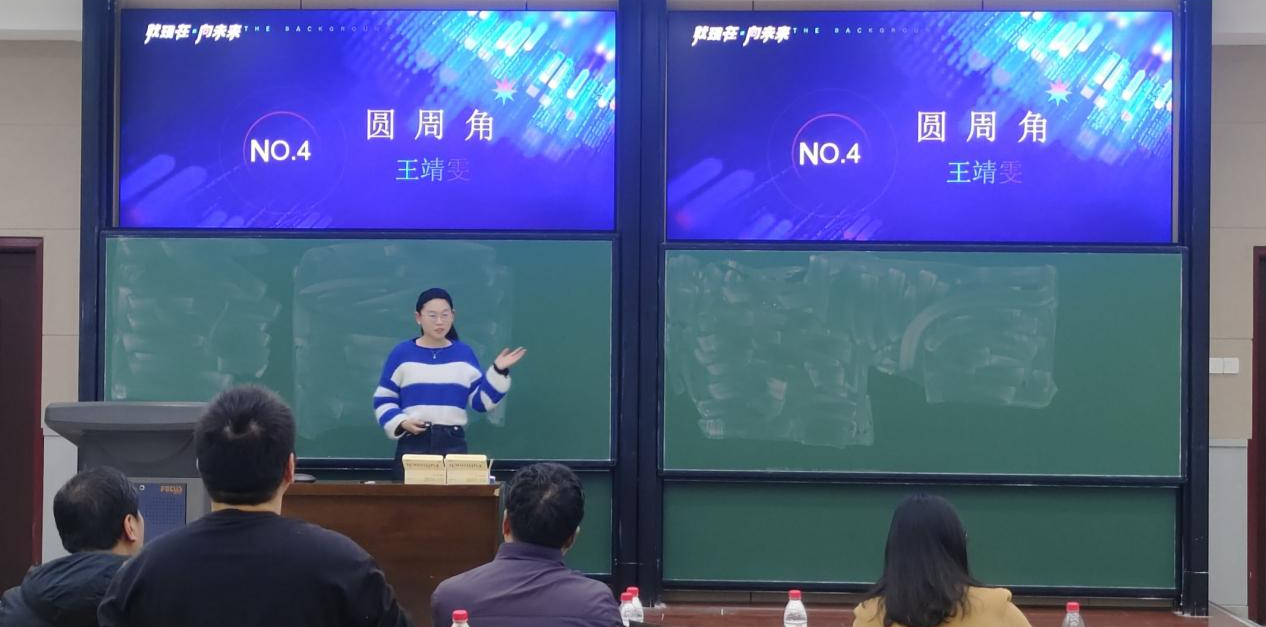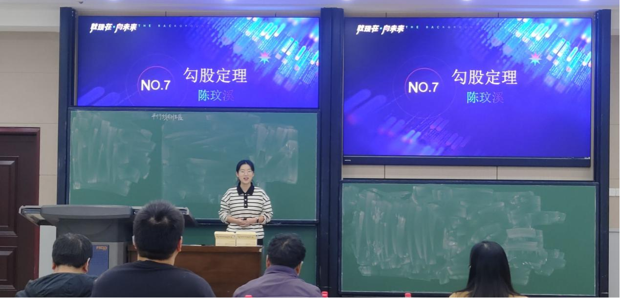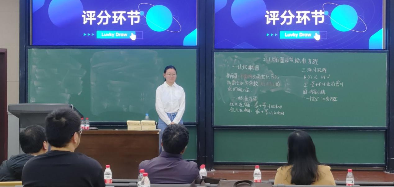 本次竞赛共分为三个环节,选手教学技能展示、评委点评、颁奖。教学技能展示环节,7名选手逐个上台进行教学展示,教学内容涉及勾股定理、平行线的性质、圆锥曲线等初中高中重点知识。选手们教学设计亮点频出,讲课生动形象,利用多媒体设备,精美的教具等丰富课堂内容,体现了选手们较为扎实的教学技能。她们用出色的才华与扎实的基本功,为我们带来了一场精彩的教学盛宴。每位选手展示教学之后,三位评委老师分别从选手的语言风格,思维逻辑,教学方式等方面进行了细致的点评,选手们认真聆听评委的点评与建议,受益匪浅。