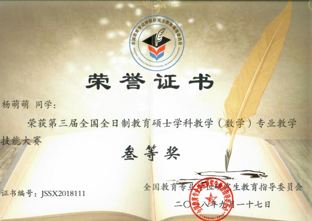 2017级学科教学(数学)专业学生杨萌萌在张玉环老师指导下参赛,获得此次比赛的全国三等奖。