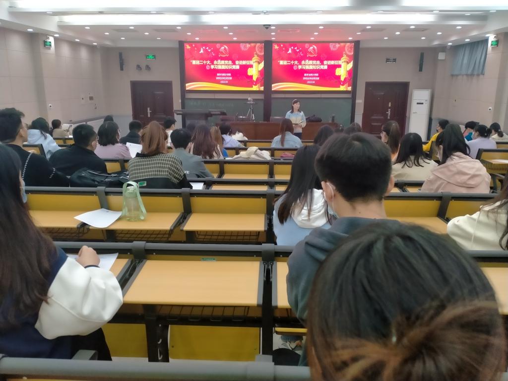 为深入学习贯彻习近平新时代中国特色社会主义思想,充分调动研究生党员、入党积极分子学习的积极性,营造“比学赶超”的浓厚学习氛围。2022年4月,研究生三个学生党支部依托“学习强国”平台,开展“喜迎二十大、永远跟党走、奋进新征程”知识竞赛,研究生全体党员以及入党积极分子分为两个小组,共计160余人参与竞赛。本次竞赛主要分为两个阶段,第一阶段为“学习强国”理论知识的积分学习,第二阶段为现场知识竞赛。在现场知识竞赛阶段,研究生辅导员、第三学生党支部书记吕晓瑞宣读现场知识竞赛的办法、规则,强调参赛选手要诚信答题,同时也祝愿各位参赛者赛出自己的真实水平,取得优异成绩。