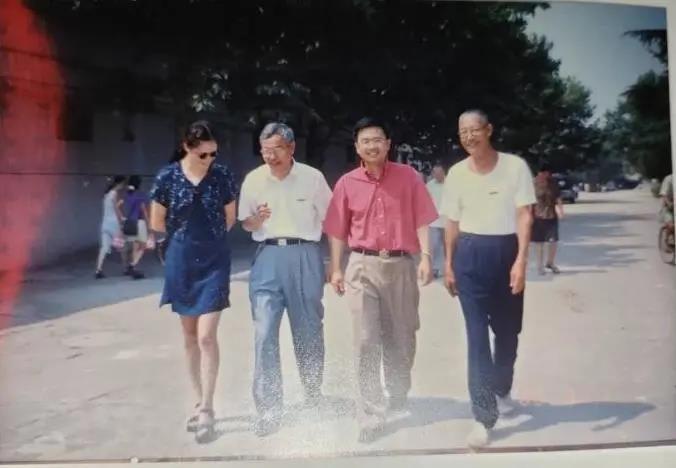 刘光耀先生(右一)与户传平、赵振海、王建平走在明伦校区主干道上