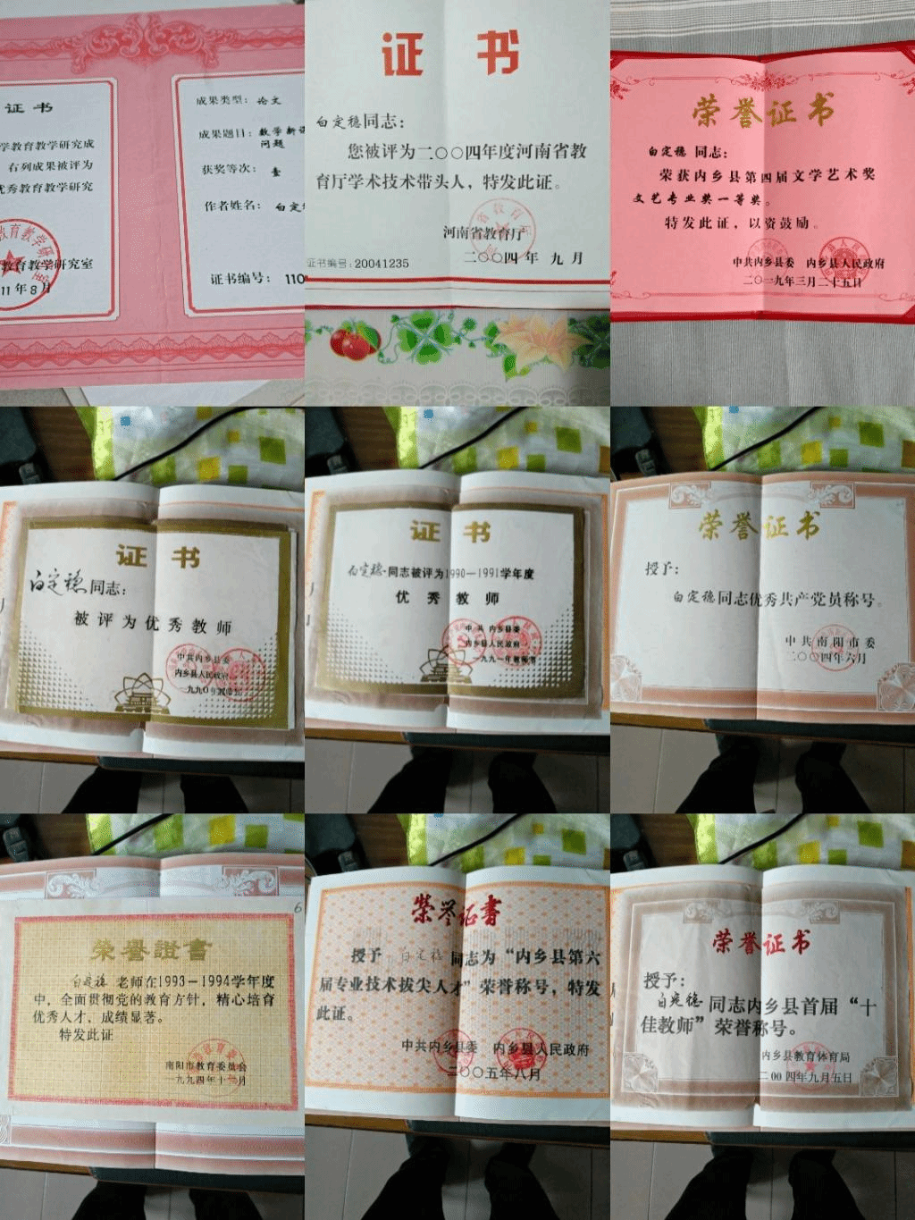 出版社出版)等多本高中教学用书,有几十篇教育教学论文在《数学通讯》、《中学数学教与学》、《中学生数理化》等刊物发表或获奖,两次获河南省中小学优秀教育教学研究成果一等奖,河南省教育厅“学术技术带头人”,南阳市“优秀共产党员”、“先进教师”、“培优教师”,内乡县“优秀教师”、“专业技术拔尖人才”、首届“十佳教师”。河南省诗词学会会员,有二百多首(副)诗词、楹联发表或获奖,获内乡县文学艺术奖文艺专业“一等奖”。