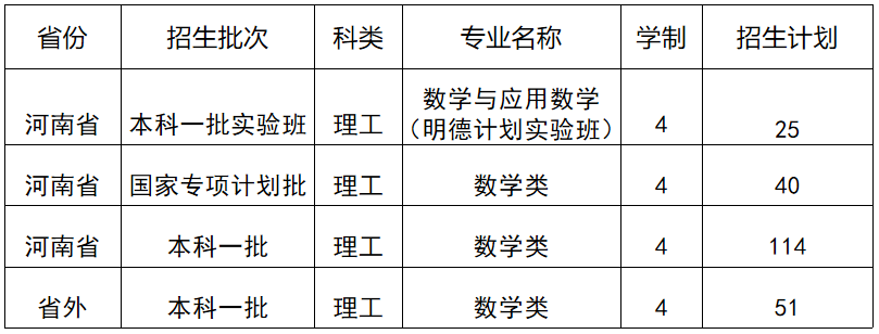 全国计划招生230人,其中“数学与应用数学(明德计划实验班)”计划招生25人(仅限河南省),“数学类”计划招生205人。
