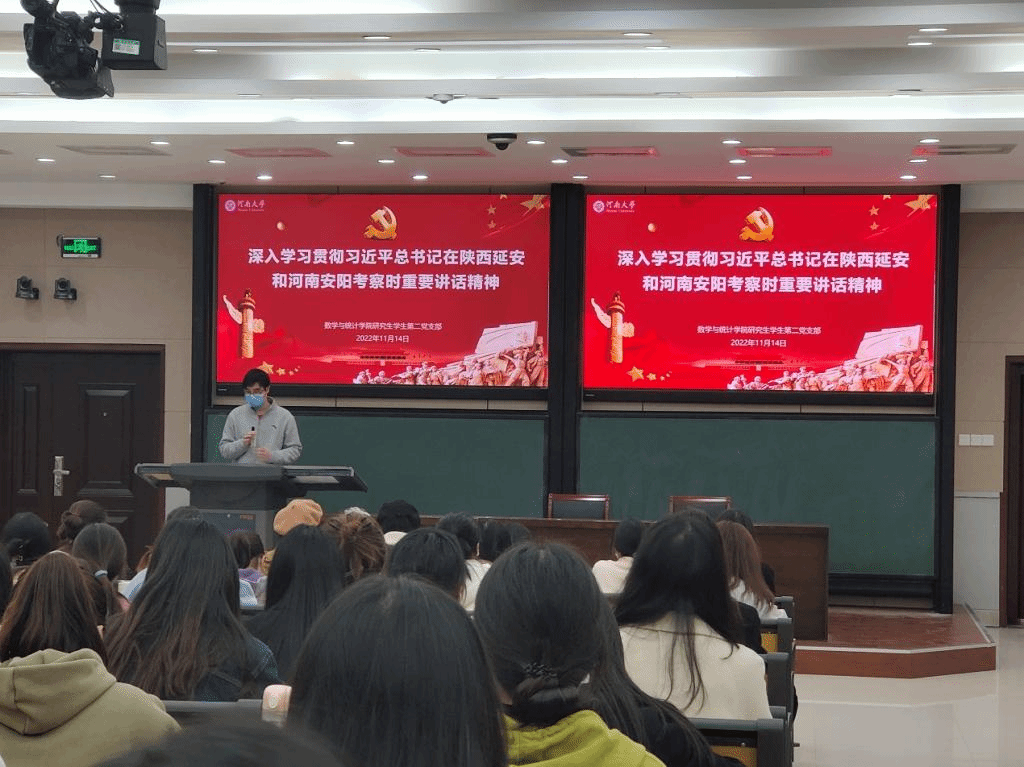 11月14日晚7:30,研究生第二学生党支部在南阶教室召开了“学习二十大,奋进新时代”主题党日活动,全体党员同志和入党积极分子参加会议。首先,支部书记刘霞宇同志领学了《习近平总书记在中国共产党第二十次全国代表大会上的报告》,接着与会同志共同观看了习近平总书记考察陕西延安和河南安阳新闻视频资料,并观看了纪录片《根脉》——红旗渠精神。
