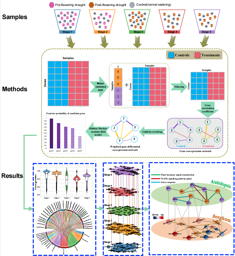 随着全球气候变暖及水资源供需矛盾的加剧,干旱已成为影响全球粮食生产的最主要的非生物因素。高粱是一种典型的耐旱性强的作物。本研究基于多时间点高粱RNA-seq数据,首先通过均方差检验筛选干旱响应的候选基因,构建加权基因差异共表达网络(WGDCNs);然后基于“guilt-by-rewiring”原则,进一步将WGDCNs与隐马尔可夫随机场模型相结合,分别鉴定了高粱的五个发育阶段的干旱响应关键基因。GO富集分析和序列比对分析表明,筛选出的基因可能在高粱的干旱响应胁迫中发挥关键作用。通过构建多层差异共表达网络及其分析,揭示高粱可能对开花前的干旱敏感的网络基础。此外,还建立了一个关键的基因调控模块,该调控模块通过植物激素信号转导、MAPK 级联和转录调控来调节干旱响应。所提出的方法可以很好地通过RNA-seq数据挖掘关键基因,相关研究可以增强我们对高粱干旱响应机制的理解,对基因工程和耐旱新品种的育种具有重要意义。